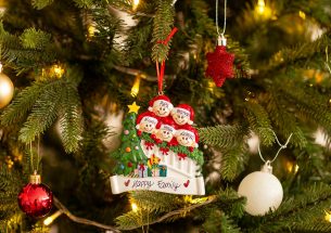 Corriamo tutti giù per la scalinata per andare in soggiorno a scartare i regali che ha portato Babbo Natale! La decorazione da appendere all’albero è pronta per essere personalizzata inserendo i nomi sui cappellini dei 5 personaggi e scrivendo una frase, un augurio o una data sul banner bianco. Le nostre bravissime decoratrici provvederanno a scrivere a mano ogni tuo desiderio, senza nessun costo aggiuntivo. Ogni decorazione sarà consegnata nella splendida Gift Box.