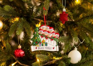 Corriamo tutti giù per la scalinata per andare in soggiorno a scartare i regali che ha portato Babbo Natale! La decorazione da appendere all’albero è pronta per essere personalizzata inserendo i nomi sui cappellini degli 8 personaggi e scrivendo una frase, un augurio o una data sul banner bianco. Le nostre bravissime decoratrici provvederanno a scrivere a mano ogni tuo desiderio, senza nessun costo aggiuntivo. Ogni decorazione sarà consegnata nella splendida Gift Box.