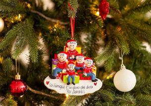 Il sogno di tutti: quest’anno a Natale sono arrivati talmente tanti pacchi che possiamo sederci sopra per contarli e iniziare a scartarli! La decorazione è pronta per essere personalizzata inserendo i nomi sui cappellini dei 5 personaggi e scrivendo una breve frase, un augurio o una data sul banner bianco. Le nostre bravissime decoratrici scriveranno a mano ogni tuo desiderio, senza nessun costo aggiuntivo. Ogni decorazione sarà consegnata nella splendida Gift Box.