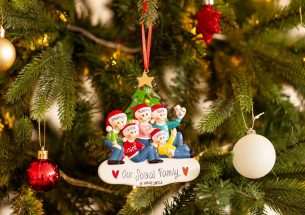 3,2,1 click! Il selfie di famiglia davanti all’albero di Natale non può mancare nell’album dei ricordi. La decorazione è pronta per essere personalizzata inserendo i nomi sui cappellini dei 5 personaggi e scrivendo una breve frase, un augurio o una data sul banner bianco. Le nostre bravissime decoratrici scriveranno a mano ogni tuo desiderio, senza nessun costo aggiuntivo. Ogni decorazione sarà consegnata nella splendida Gift Box.