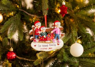 Uno dei divertimenti più belli dell’inverno è scivolare con la slitta sulla neve insieme alla famiglia e agli amici. La decorazione è pronta per essere personalizzata inserendo i nomi sui cappellini dei 3 personaggi e scrivendo una breve frase, un augurio o una data sul banner bianco. Le nostre bravissime decoratrici scriveranno a mano ogni tuo desiderio, senza nessun costo aggiuntivo. Ogni decorazione sarà consegnata nella splendida Gift Box.