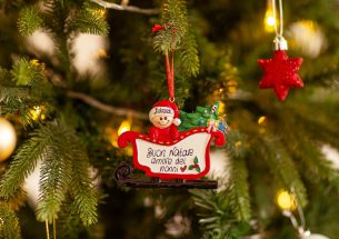 Un giro nella slitta carica di regali è quello che ci vuole per portare allegria durante le vacanze di Natale. La decorazione da appendere all’albero è pronta per essere personalizzata inserendo il nome sul cappellino del personaggio e scrivendo una frase, un augurio o una data sul banner bianco. Le nostre bravissime decoratrici provvederanno a scrivere a mano ogni tuo desiderio, senza nessun costo aggiuntivo. Ogni decorazione sarà consegnata nella splendida Gift Box.