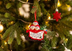 Un giro nella slitta carica di regali è quello che ci vuole per portare allegria durante le vacanze di Natale. La decorazione da appendere all’albero è pronta per essere personalizzata inserendo i nomi sui cappellini dei 3 personaggi e scrivendo una frase, un augurio o una data sul banner bianco. Le nostre bravissime decoratrici provvederanno a scrivere a mano ogni tuo desiderio, senza nessun costo aggiuntivo. Ogni decorazione sarà consegnata nella splendida Gift Box.