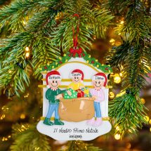 Il sogno di tutti: un sacco pieno di regali da scambiarsi per Natale. Doni unici, desideri che si avverano e attimi di felicità che rimangono impressi nella mente. La decorazione è pronta per essere personalizzata inserendo i nomi sui cappellini dei 3 personaggi e scrivendo una breve frase, un augurio o una data sul banner bianco. Le nostre bravissime decoratrici scriveranno a mano ogni tuo desiderio, senza nessun costo aggiuntivo. Ogni decorazione sarà consegnata nella splendida Gift Box.